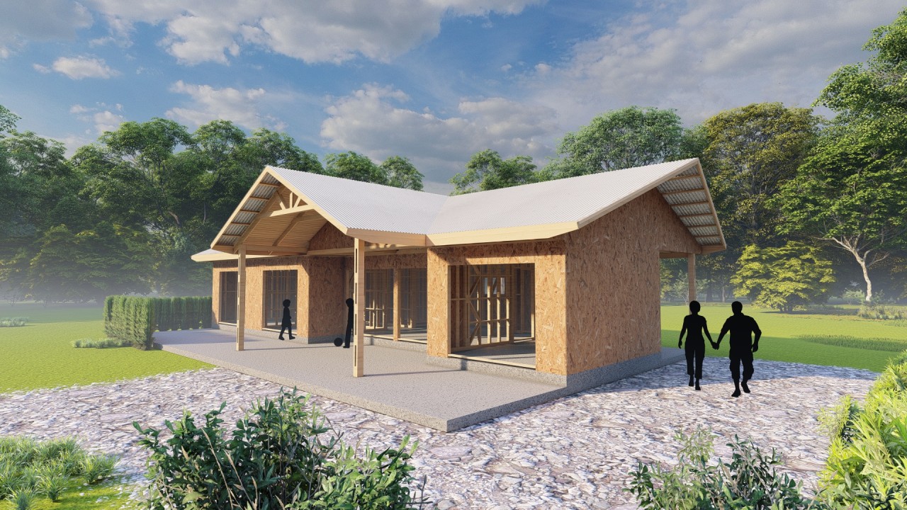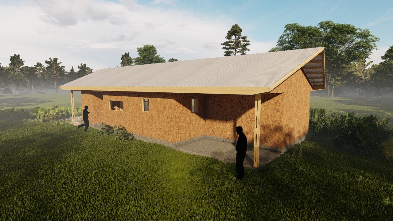 - Estructura de tabiques interiores, exteriores, cerchas, cercha decorativa y frontones, todo en pino, calibrado, secado en cámara, anti-hongo y anti-termita. Revestimiento de terciado ranurado 12mm para vigas exteriores a la vista.